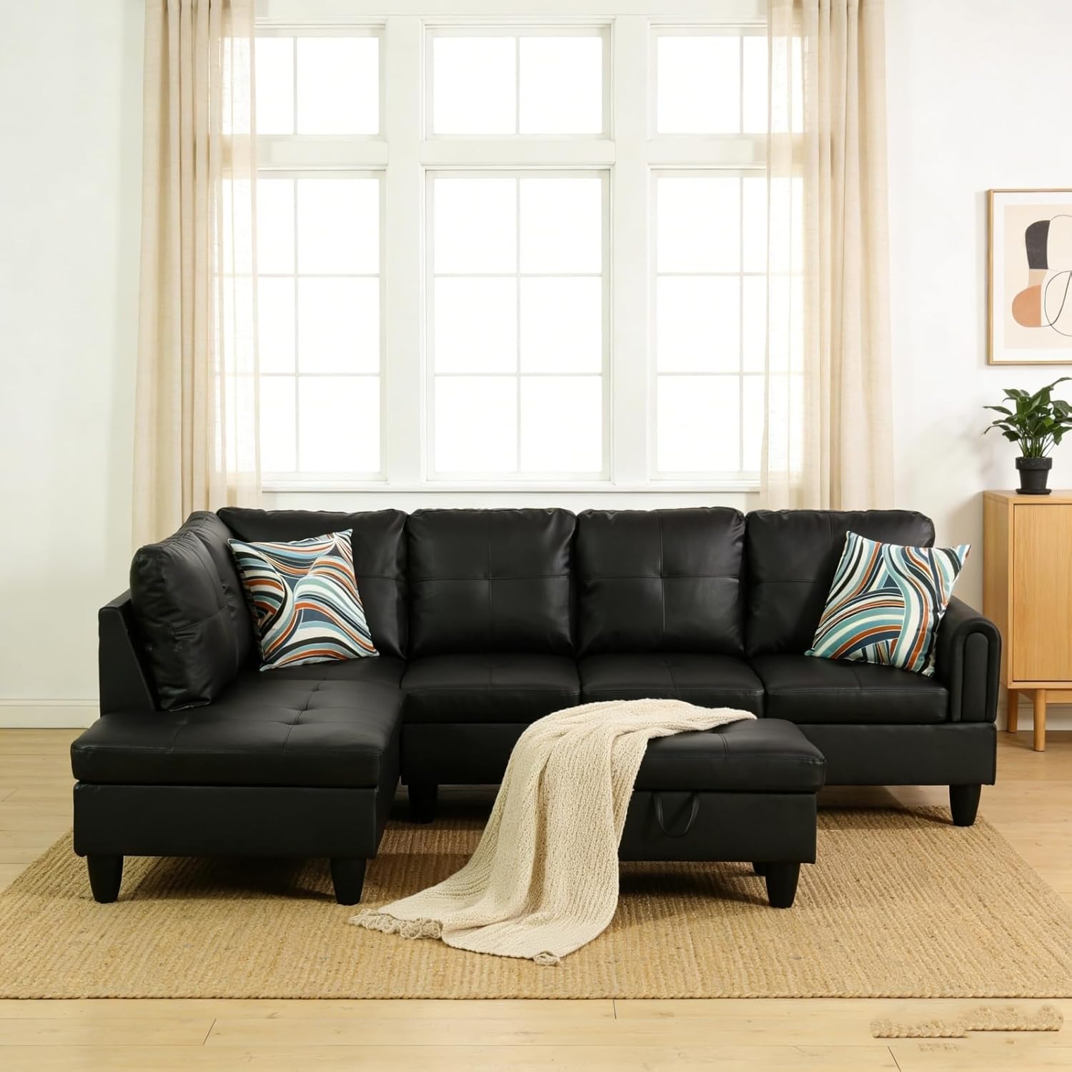 Trygoal 93.7" L-Shaped Sectional Sofa with Storage Chaise, Modern Couch for Living Room, Chenille Upholstered Couch with Deep Seats & Throw Pillows, Modern Corner Sofa for Living Room, Black