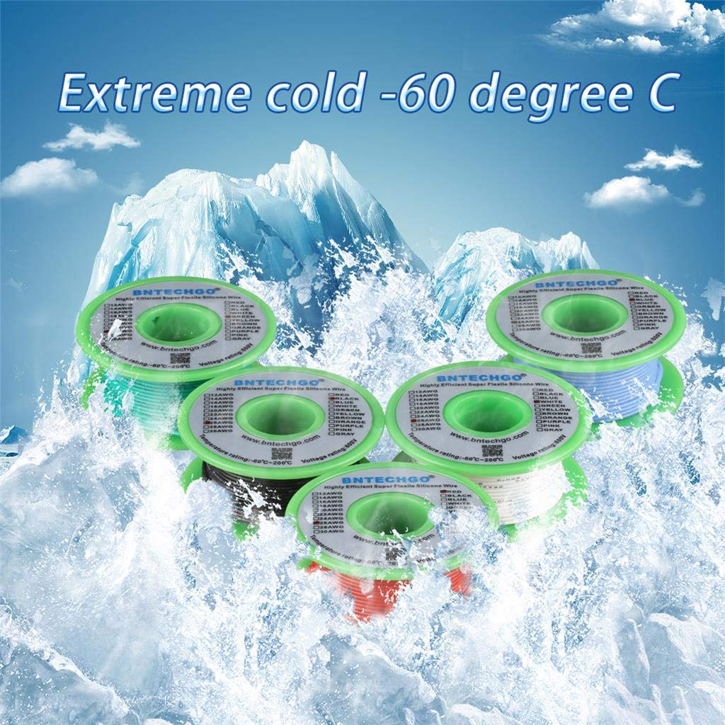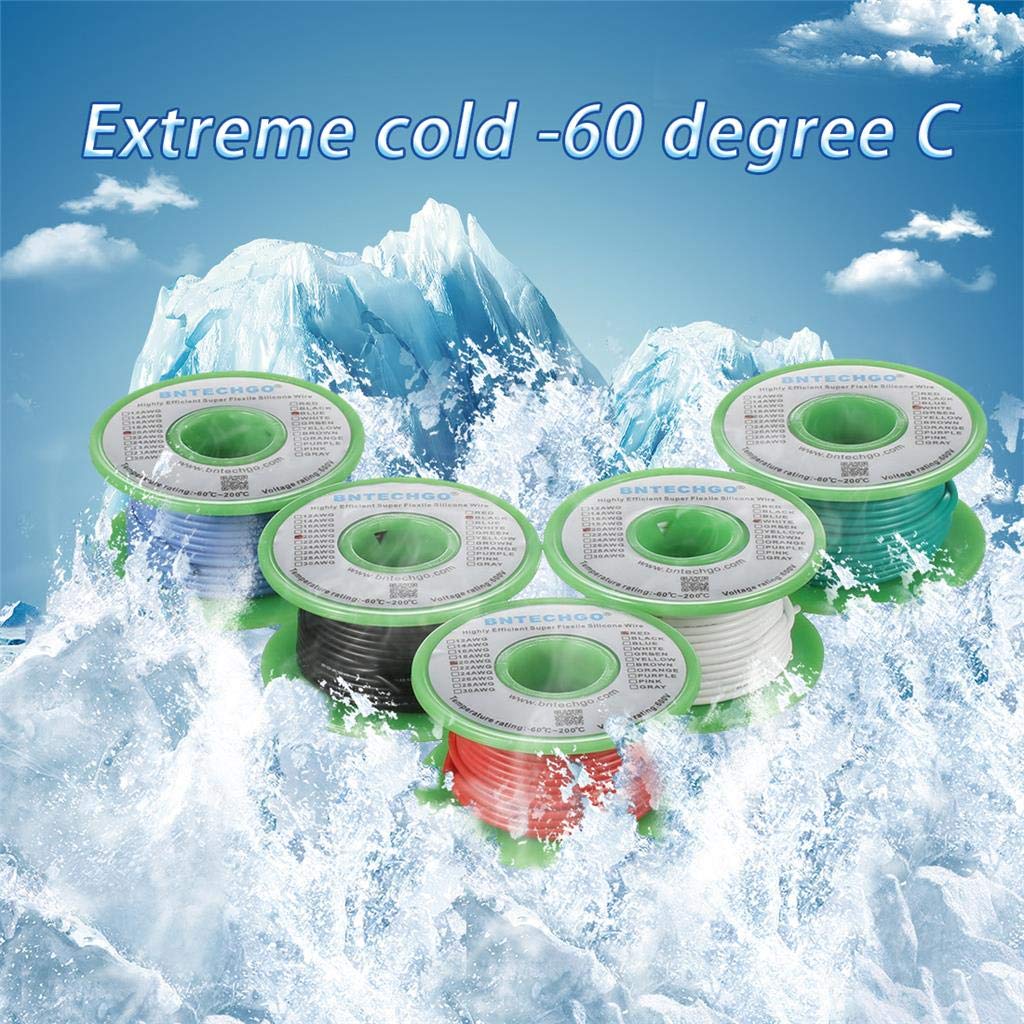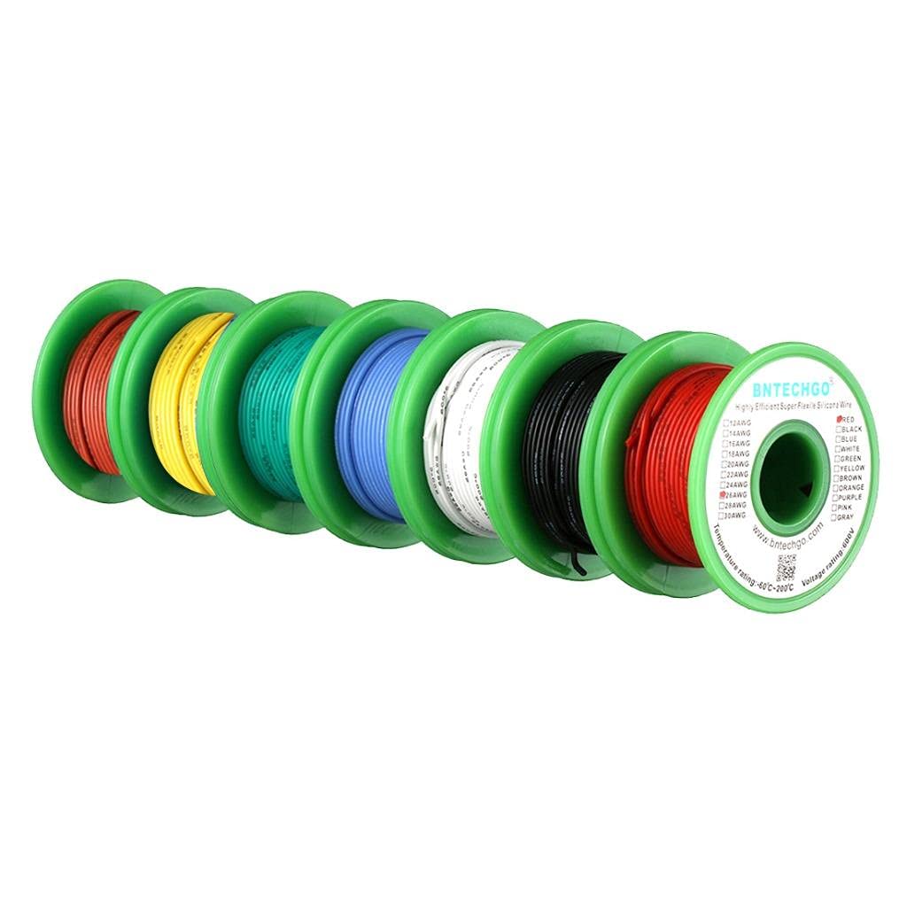 1.High Quality Ultra Flexible Soft Silicone Rubber Copper Wire!Super Low Impedance,Highly Efficient!2.High strand count copper core,24 AWG silicone stranded wire has 40 strands 0.08 mm tinned copper wire,the copper strands are tinned,protecting them from corrosion and making it easier to solder.3.They are constructed with premium silicone rubber insulation.High temperature resistance 200 degree C,Low temperature resistance,in extreme cold -60 degree C.Rated Voltage: 600 volts.Outside diameter 1.6 mm,tolerance +/- 0.1 mm.4.24 gauge silicone wire kit: 6 colors,red,black,blue,white,green and yellow,each color 100 ft,total 600 feet.5.BNTECHGO silicone wire are widely used for model planes,model cars,model ships,lamps,household appliances,electric heating appliances,meters,instruments,motor and digital fields.Also available the right gauge wire from thin 30 AWG to heavy duty 8 AWG silicone wire.8 AWG and 10 AWG available red and black;12 AWG and 14 AWG available 7 colors(Red,Black,Blue,Yellow,Green,White and Gray);16 AWG to 30 AWG available 11 colors(Red,Black,Blue,Yellow,Green,White,Brown,Gray,Purple,Orange and Pink).