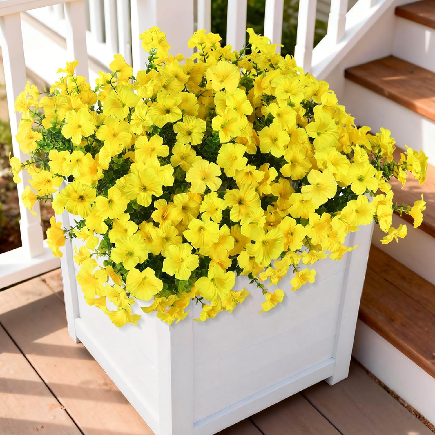 PACKAGE:This package comprises a total of 12 bundles artificial outdoor flowers morning glory with green eucalyptus leaves,Artificial petunia come in a total of 6 colors,2 Deep Purple,2 Deep Orchid,2 Deep Pink,2 Rose Red,2 yellow,and 2 white.Colorful blooms allows for creating stunning flower arrangements and bouquets,Perfect for enhancing color and vitality to your living spaces.