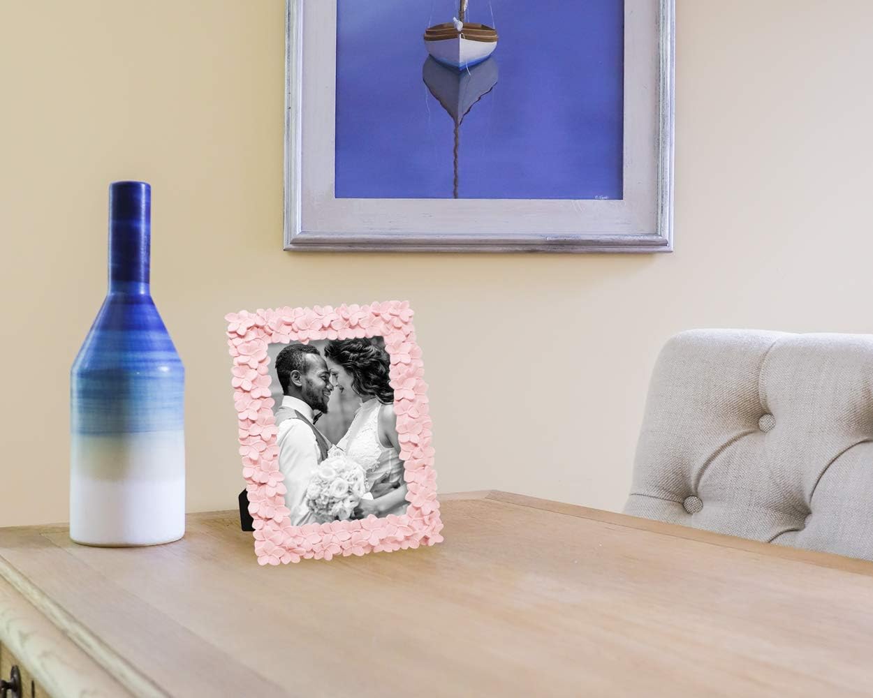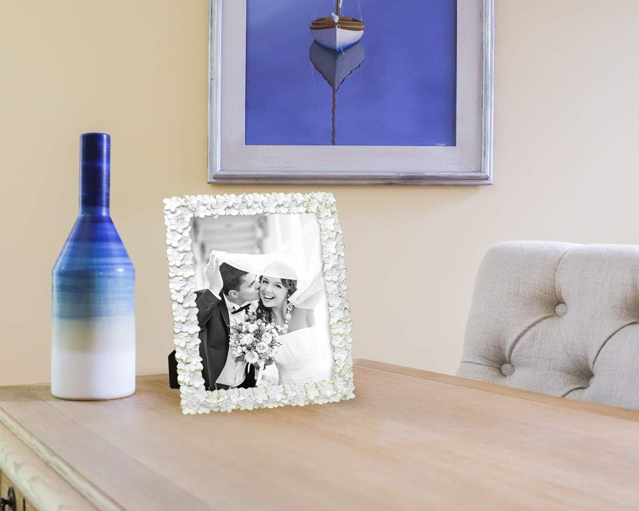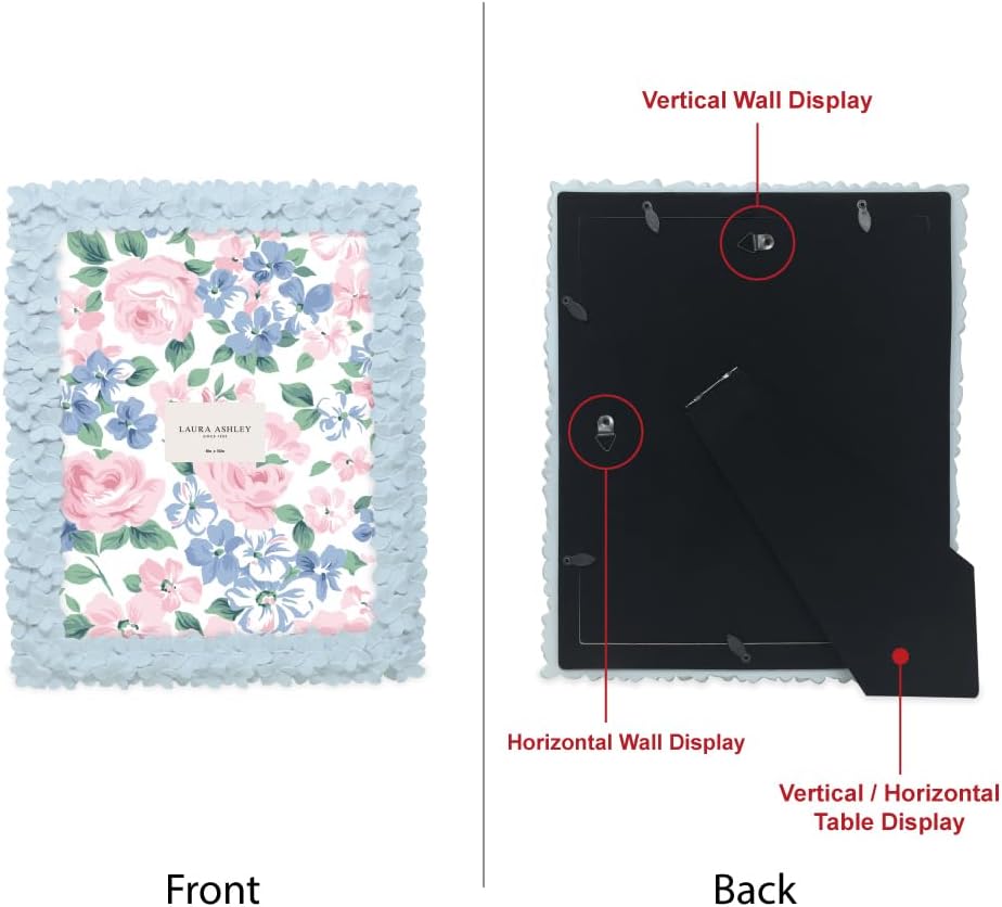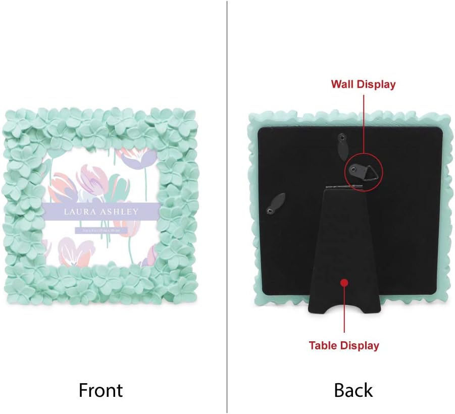 This Laura Ashley decorative floral tabletop picture frame is hard to miss in any room. It gives new splendor and joy to any picture you house within its ornate patterns. A gorgeous frame design that draws attention to whatever photo is inside, whether professional wedding day pictures or casual childhood memories. Your memories will remain safe and secure in this frame -- the easy-flip tabs secure the photo or artwork in place once the back is closed. For anyone who enjoys the sentimental value of a picture, this exquisite romantic floral frame is a practical and meaningful gift option for friends and loved ones to display and spotlight their fondest memories. Whether you’re looking for a gift for a birthday, anniversary, housewarming, wedding, new job, or just the holidays, this frame’s sleek combination of emotional appeal, household use, and decorative flexibility make it a lovely giftable option for any girl or women in your life - mother, grandmother, daughter, sister, aunt, girlfriend etc. This essential piece is easy to fit anywhere in your home. The eloquent floral design comprising this photo frame make your cherished fond memories impossible to miss in any room. Try it on your desk, atop an end table or TV stand, on corner shelves, or at one end of a well-stocked bookshelf. Alternatively, mount it to the wall for a brilliant collage of happy photos. No matter where in your house you place it, this frame will both bring new life to your favorite photo and add extra decorative flair to any room. This flower resin picture frame comes with a stand that keeps your photo steady while orienting it. You can pull the kickstand easel out to secure your frame in either portrait or landscape mode, giving you a full diversity of photo options to showcase with this versatile frame