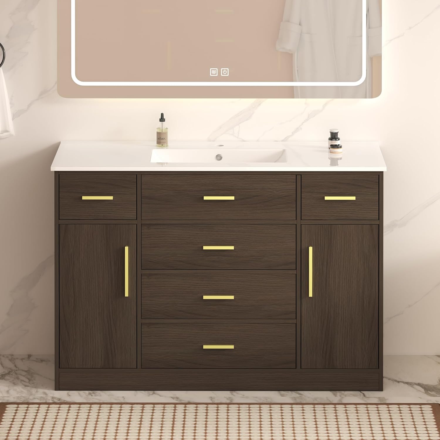 LUMISOL focuses on providing you with high-quality furniture and is committed to bringing happiness to every buyer's life. Overall: 47.64"L x 18.5"W x 33.07"H Vanity Weight Capacity: 300LBS Color: White / Black / Green Overall Product Weight: 155LBS Vanity Material: MDF Sink Material: Ceramic Faucet Mount: Single Hole Level of Assembly: Full Assembly Needed Suggested Number of People: 2 Additional Tools Required: All Tools Included Number of Package: 2 Country of Origin: Vietnam LUMISOL Notice: All colors on our website are for reference only, actual product colors may vary a little bit, due to different color settings of every screen device. Please note: most of our sofas are hand-measured, therefore the dimensions are for reference only, and may marginally deviate.