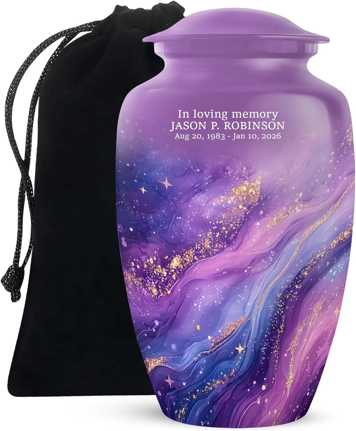 Our blue abstract burial urn for adult human ashes male & female - large burial urns for man & woman, this purple abstract large urn for human ashes female is designed with dignity and artistry. Families seeking cremation urns for women will appreciate its strength, secure lid, and decorative presence as a timeless tribute. This 5-piece cremation set includes a 200 cu in large urn for grandfather ashes along with four keepsakes. Handcrafted for strength and elegance, it offers a dignified way for families to preserve his ashes and share keepsakes with loved ones. Crafted with care, it provides a respectful resting place that preserves love and memory, honoring life with beauty and dignity. Its graceful design brings peace and comfort, creating a secure final resting place while honoring life’s story through dignity, elegance, and quiet reverence. Ideal for fathers, husbands, or male loved ones, perfect for display or burial. Its elegant style makes it perfect for honoring loved ones at home, on the move, or during services. This large funeral urn for ashes adult woman provides both beauty and protection. With its screw lid closure, ashes remain secure, avoiding spills, while families find peace in its graceful design. Cremation urn for adult- designed with beauty and respect, this burial urn for adult human ashes can be used as a sentimental gift or displayed as elegant home décor, serene memory of your loved one. This memorial large urn for male is lightweight and portable, crafted for ease of transport. A practical choice for families, it functions as urns for ashes adult female mom & dad, offering a secure and decorative way to honor loved ones at home or during travel.