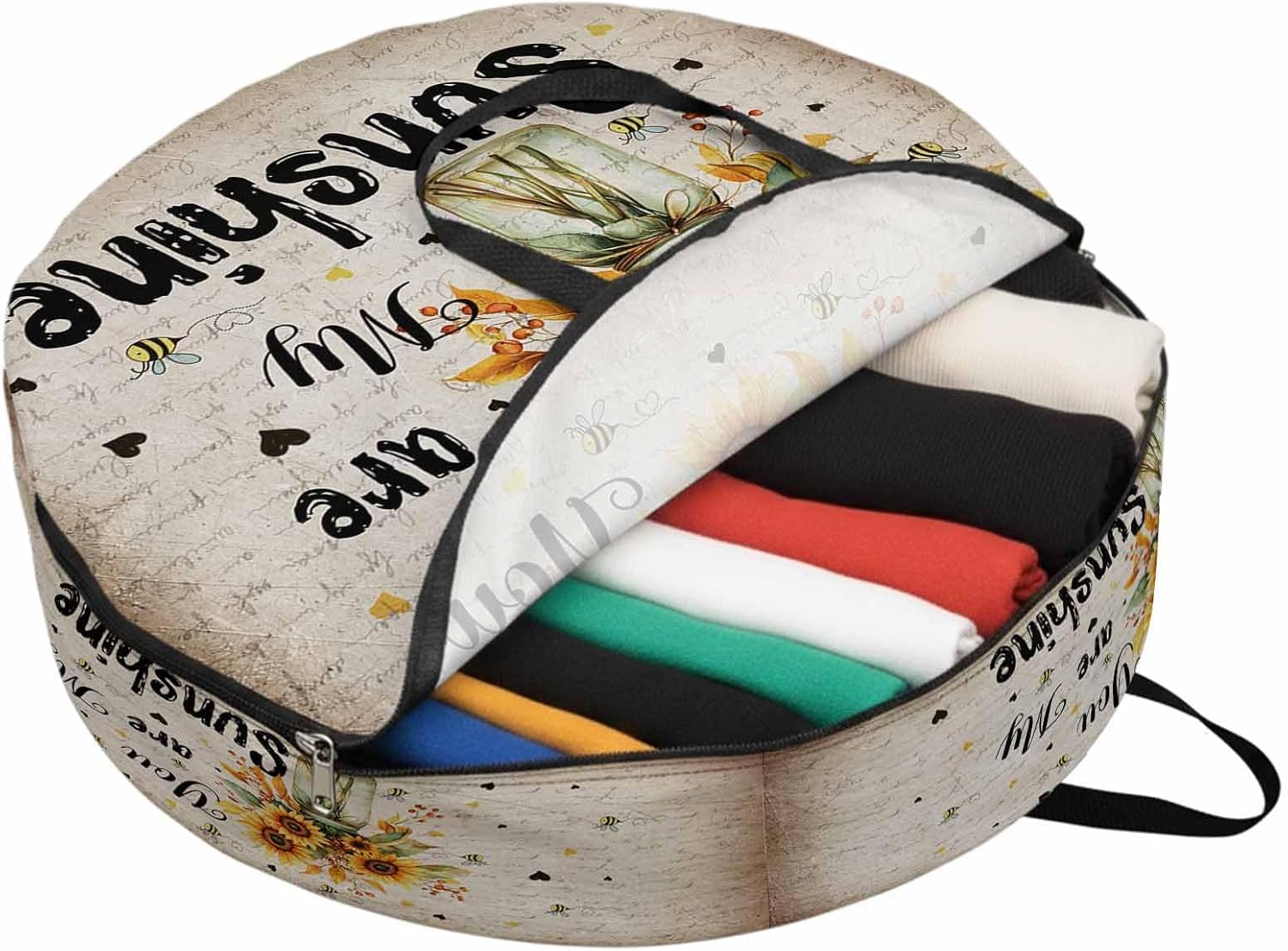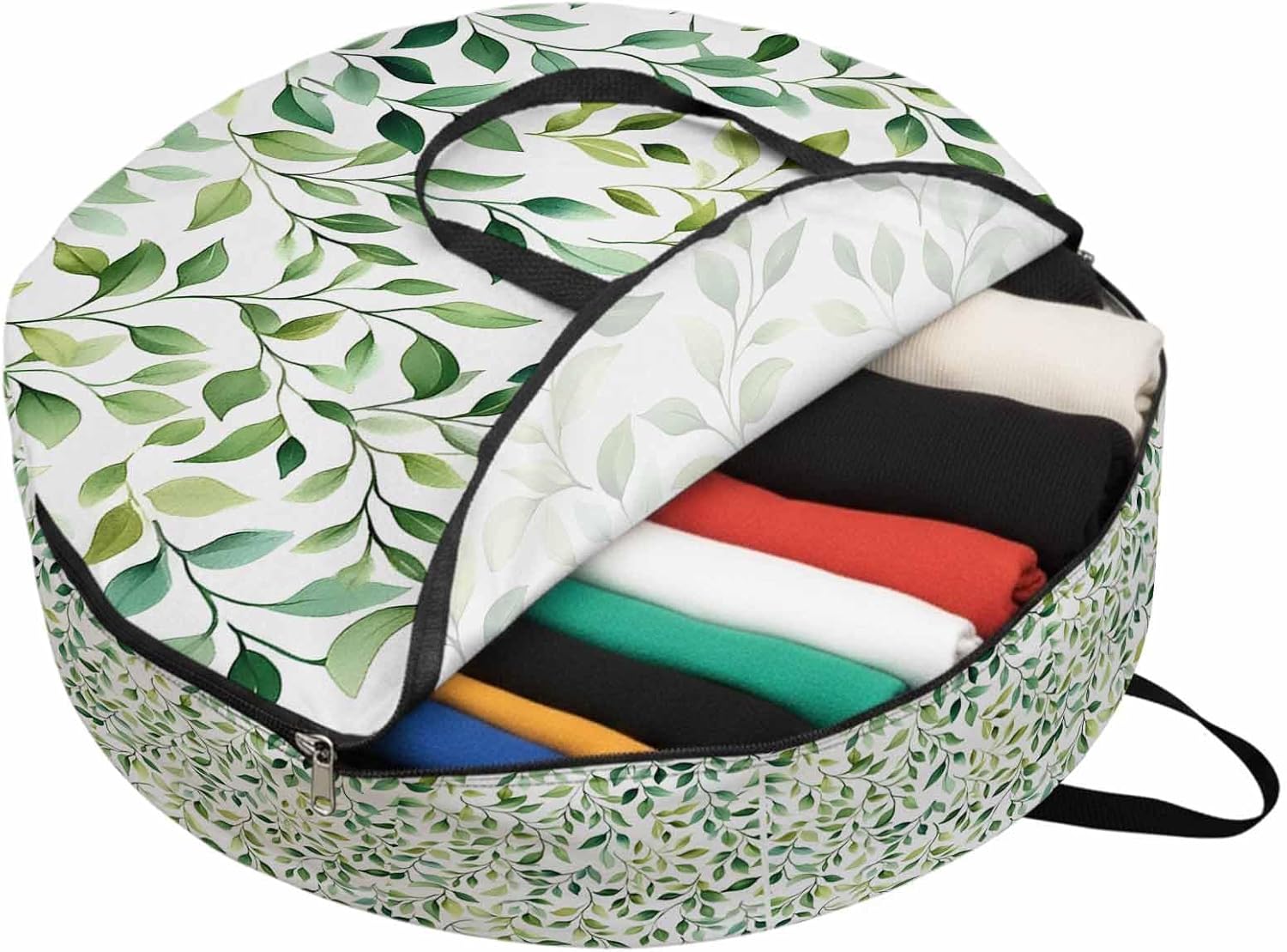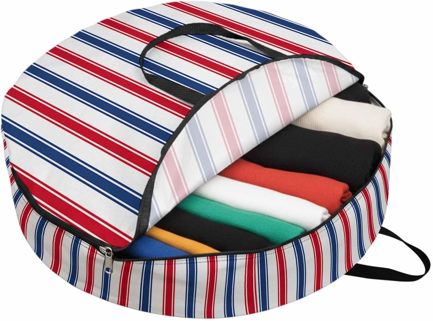Reclaim Your Closet Space with the Round Storage Solution! Material: polyester Diameters: 24 inch, 30 inch, 36 inch Depth: 7 inches Package Includes: Round Storage Bag One Bag, Endless Possibilities: Whether you are swapping out your summer wardrobe, moving into a new dorm, or packing away holiday decorations, this bag has you covered. The circular design is uniquely suited for: Bedding: Comforters, quilts, sheet sets, and oversized pillows. Clothing: Winter coats, sweaters, and bulky ski gear. Home Decor: Holiday wreaths, garlands, and floral arrangements. Outdoor Gear: Camping blankets, sleeping bags, and beach towels. Dual Zippers: The high quality double zipper design allows the closet organizer to open wide from both sides, making it effortless to load and unload even the bulkiest comforters or wreaths. Reinforced Handles: Sturdy, reinforced handles are securely stitched to provide extra strength and a comfortable grip when carrying heavy loads or pulling the bag from under a bed. Clear Label Pocket: A transparent built-in label holder allows you to quickly identify the contents of each bag without ever having to unzip it, keeping your storage perfectly organized.