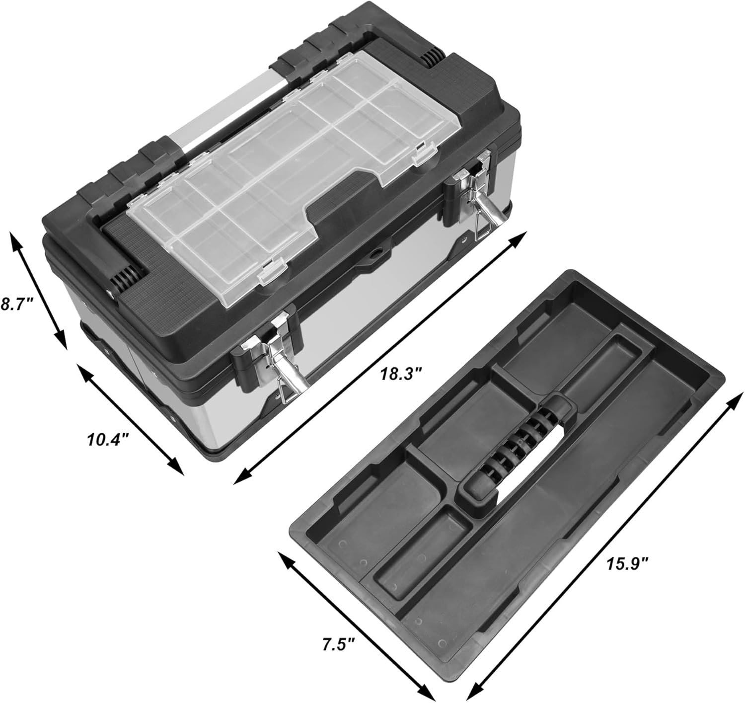 This plastic tool box is made of durable and robust materials ensuring long-lasting performance and protection for your tools. The outside dimensions: L 17.6"" * W 9.2"" * H 8.8"" and the internal dimensions: L 16.2"" * W 7.3"" * H 6.8"". Its easy-to-carry alum alloy handle and lightweight construction make this plastic tool box a convenient choice for transporting your tools to any job site. The removable trays for organization provide ample storage space which allow simple organization of smaller tools and accessories keeping them within easy reach while you work. Two strong metal snap locks keep the tool box securely closed ensuring your tools remain stable and protected during transport. The toolbox features a steel latch with a small latch hole that can be padlocked or zipped to secure the case (purchased separately). Last but not least, the thoughtful head cover design also provides the added strength and extra space which improves functionality all around during your work.